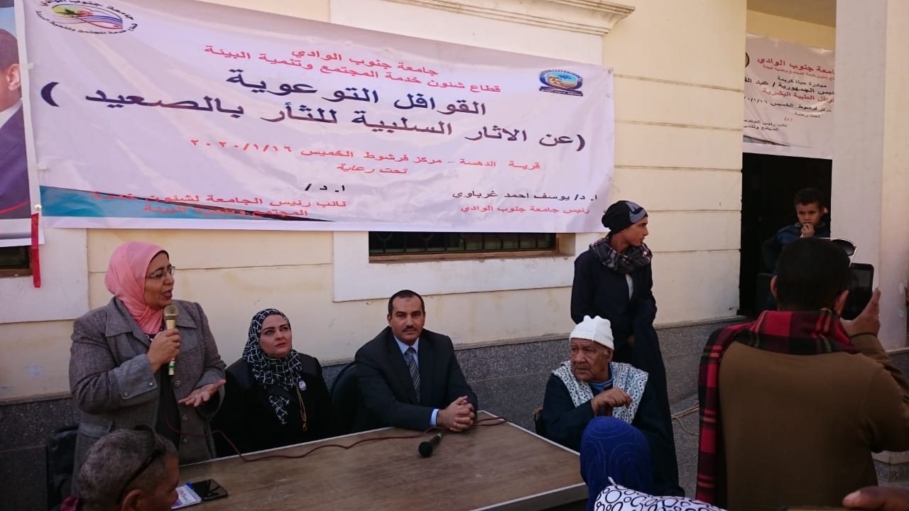 نظم قطاع خدمة المجتمع وتنمية البيئة بجامعة جنوب الوادى، قافلة توعوية عن الآثار السلبية للثأر بالصعيد، والتى أقيمت بقرية الدهسة بمركز فرشوط، شمال قنا، تحت رعاية الدكتور يوسف غرباوى رئيس الجامعة وإشراف الدكتور سهير ربيع القائم بعمل نائب رئيس الجامعة لشئون خدمة المجتمع وتنمية البيئة.