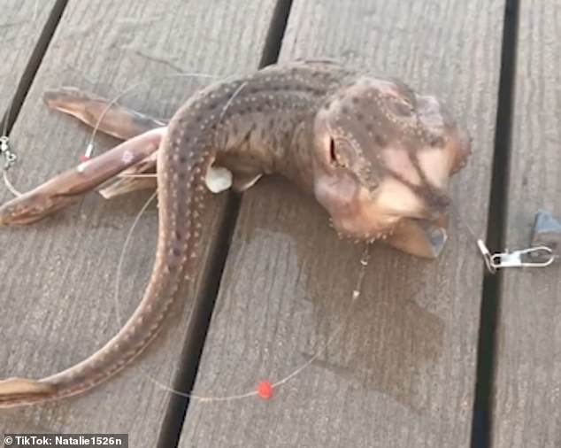 ويوضح الفيديو الذي التقطه الصياد،المخلوق ذا الرأس المنتفخ وخيط صيد في فمه الضخم بعد أن تم صيده قبالة جزيرة كوني ، بروكلين.