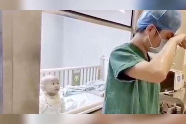 محتجزًا في غرفة الحجر الصحي بمستشفى ووهان، وحاول الطفل الجالس في غرفة زجاجية