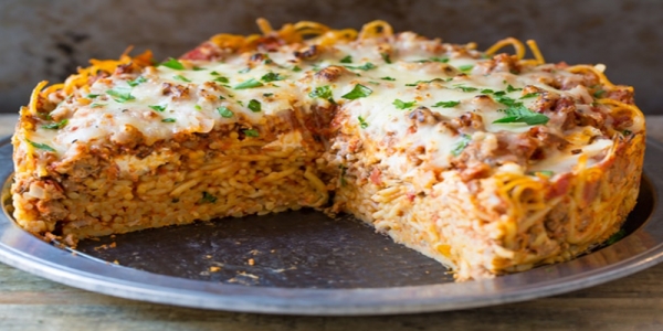 * يصب خليط المكرونة في صينية مدهونة بالزيت ويسوى الوجه