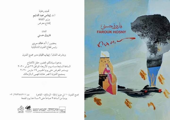 يفتتح معرض الفنان فاروق حسنى بحضور الدكتور خـــــالـــــــد سرور رئيس قطاع الفنون التشكيلية و داليا مصطفى رئيس الإدارة المركزية لمراكز الفنون والفنان إيهاب اللبان مدير مجمع الفنون وذلك فى تمام الساعة السابعة مساء يوم الأربعاء الموافق 26 فبراير 2020 بمجمع الفنون " قصر عائشة فهمى " بالزمالك.