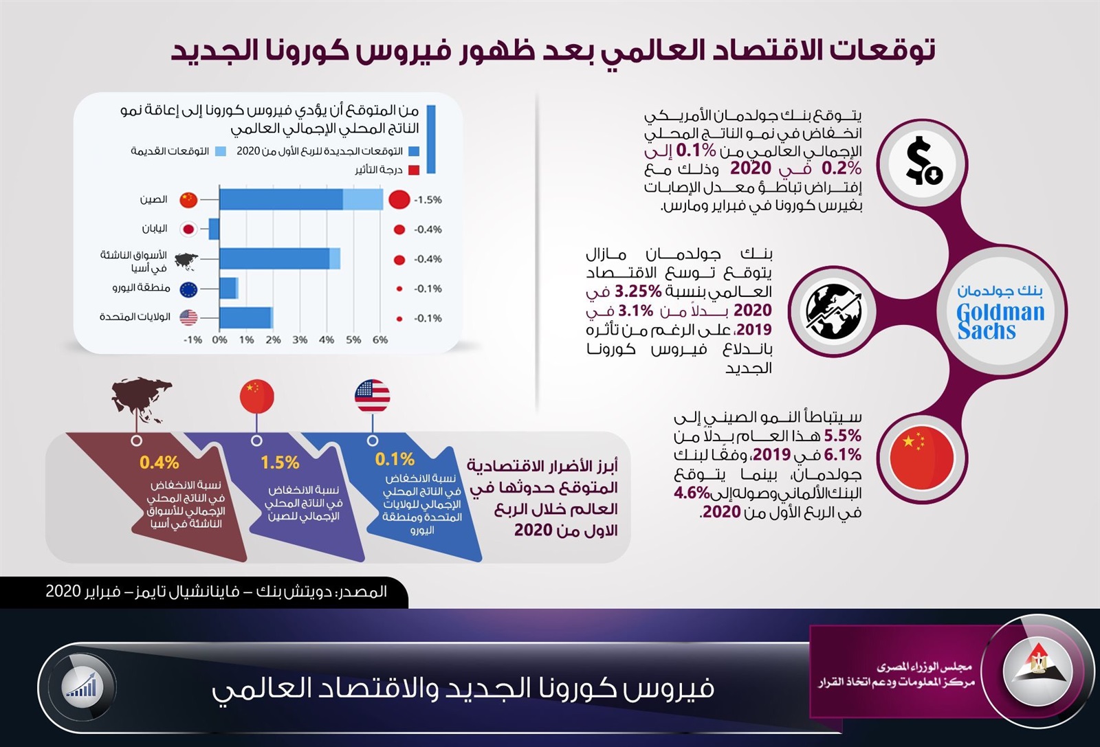 وأوضح الانفوجراف، أن بتك جولدمان الأمريكي يتوقع انخفاض نمو الناتج المحلي الاجمالي العالمي من 0.1% الى 0.2% في عام 2020 وذلك مع افتراض تباطؤ معدل الإصابات بفيروس كورونا في فبراير ومارس .