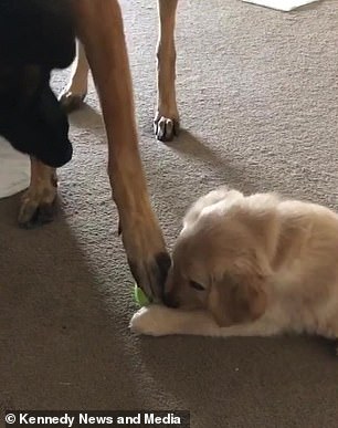 وتداول رواد التواصل الاجتماعي مقطع فيديو لكلب صغير يلعب بكرة تنس خضراء صغيرة كاد أن يبتلعها وتتسبب في موته، لكن الكلب الكبير فكر بسرعة لإنقاذ الموقف.