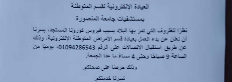 كما وجه الشكر لجميع الأطباء وهيئة التمريض المتواجدين للتواصل مع المرضى على مدار 24 ساعة لمتابعة المرضى وتشخيص الحالات وتقديم العلاج المناسب لهم، مضيفا أنه يمكن الاستفسار من العيادة الإلكترونية عن طريق الرقم 01094286543 يوميا من الساعة 9 صباحا حتى 4 مساء ما عدا الجمعة.