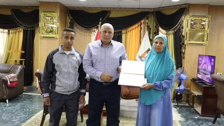 كرم اللواء محمد الزملوط محافظ الوادي الجديد، السيدة عزيزة محمد مسعد عمران، من مركز باريس الحاصلة على المركز الأول على مستوى المحافظة، في مسابقة الأم المثالية لعام 2020.