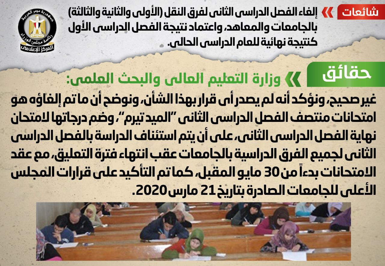 وتواصل المركز الإعلامي لمجلس الوزراء مع وزارة التعليم العالي والبحث العلمي، والتي نفت تلك الأنباء، مُؤكدةً أنه لم يصدر أي قرار بهذا الشأن، مُوضحةً أن ما تم إلغاؤه هو امتحانات منتصف الفصل الدراسي الثاني "الميد تيرم" وضم درجاتها لامتحان نهاية الفصل الدراسي الثاني، على أن يتم استئناف الدراسة بالفصل الدراسي الثاني لجميع الفرق الدراسية بالجامعات عقب انتهاء فترة التعليق، مع عقد الامتحانات بدءًا من 30 مايو المقبل،كما تم التأكيد على قرارات المجلس الأعلى للجامعات الصادرة بتاريخ 21 مارس 2020.