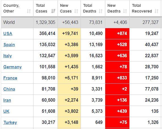 وبحسب موقع "وورلد أوميتر" الذي يرصد حالات الإصابة والوفيات بفيرةس كورونا حول العالم، جاءت إيطاليا في المركز الثالث بعدد مصابين 132547 مصابا، فيما جاءت اسبانيا في المركز الثاني بتعداد مصابين 135030، وحلت الولايات المتحدة الأمريكية في المركز الأول بأكبر عدد مصابين حيث بلغ عددهم 356414 مصابا.
