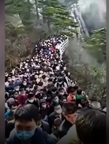 ويظهر في الفيديو توافد عشرات الآلاف من المواطنين في الصين إلى منتزه جبل جوانهشان، شرق الصين بعد إعلان إدارة المنتزه أن الدخول مجاني في ذلك اليوم.