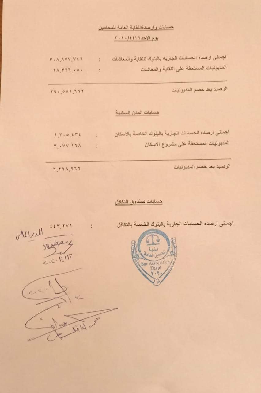 وتجاوزت أرصدة الحسابات الجارية للنقابة العامة والمعاشات مبلغ 290 مليون جنيه بعد خصم المديونيات المستحقة عليها، وتجاوزت الأرصدة الجارية لحسابات المدن السكنية بعد خصم المديونيات مبلغ 6 مليون جنيه، بينما تجاوز إجمالي أرصدة الحسابات الحارية بصندوق التكافل 443 ألف جنيه.