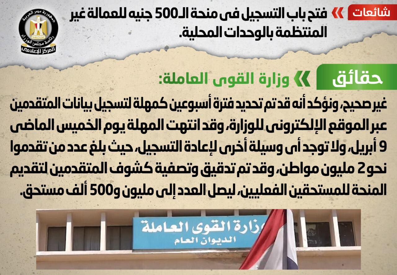 نفى المركز الإعلامي لمجلس الوزراء ما تداولته بعض المواقع الإلكترونية وصفحات التواصل الاجتماعي من أنباء بشأن فتح باب التسجيل في منحة الـ 500 جنيه للعمالة غير المنتظمة بالوحدات المحلية.