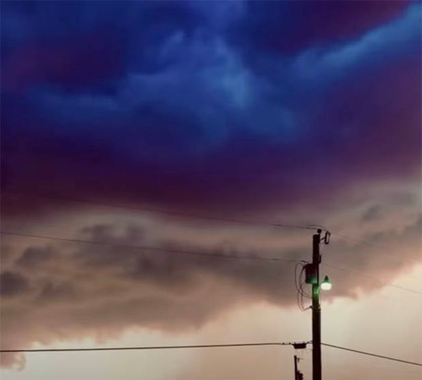 وكانت للعاصفة، تتوهج باللون أزرق على الرغم من كون بقية السماء عبارة عن مزيج من اللون البرتقالي والرمادي.