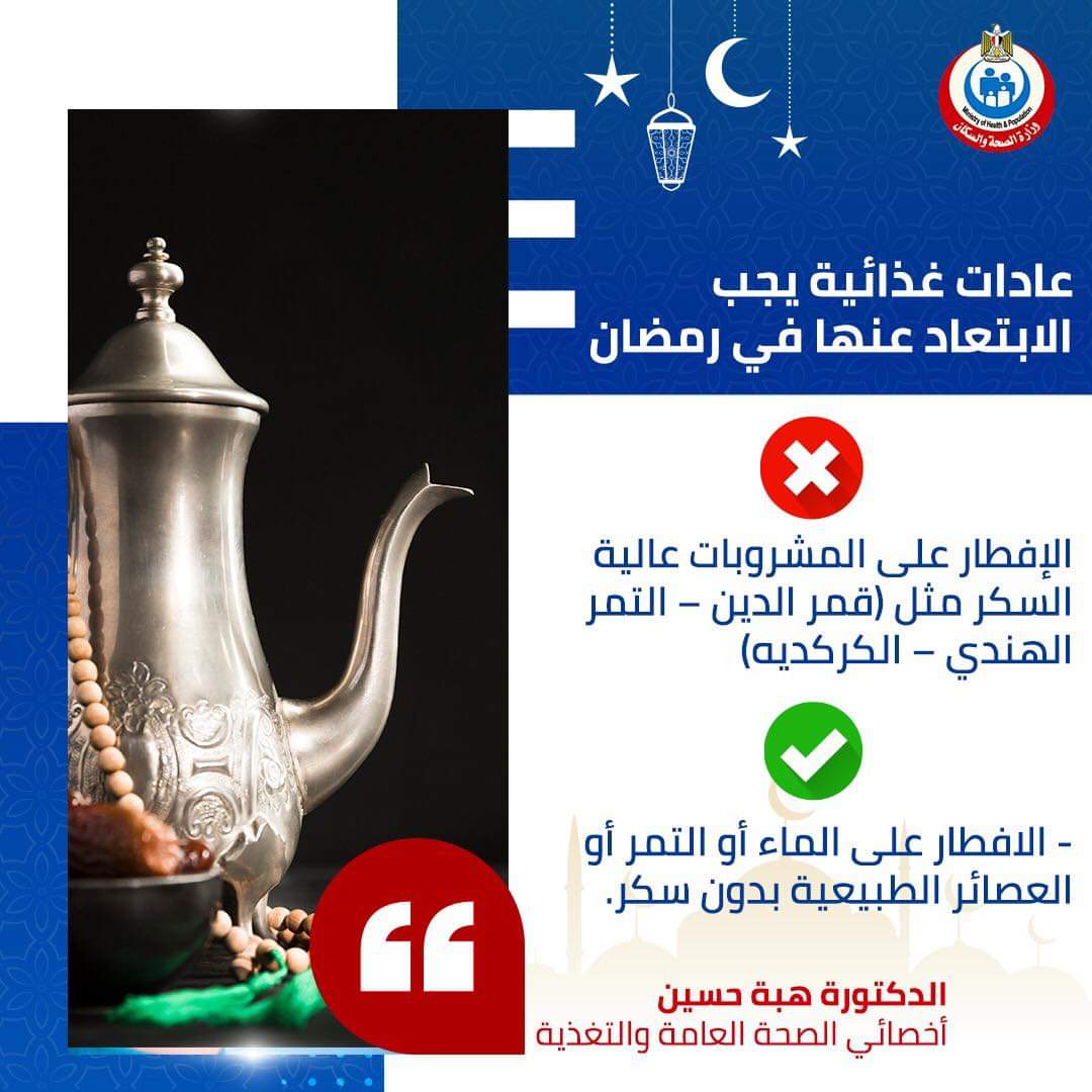 وقالت الدكتورة هبة حسين، المتخصصة بالصحة العامة والتغذية، إنه يجب عدم الإفطار على المشروبات عالية السكر مثل "قمر الدين، التمر الهندي، الكركديه".