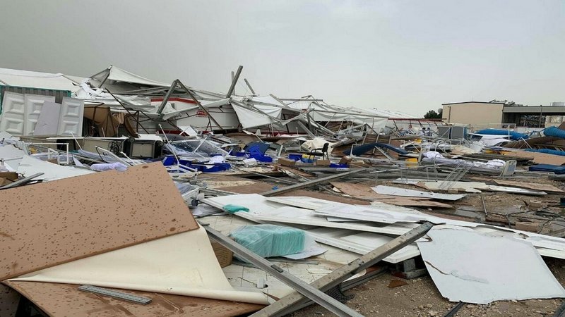 ونقلت وكالة أنباء قطر في تغريدة على موقع تويتر عن وزارة الصحة العامة قولها: إن رياحًا قوية بلغت سرعتها 72 كيلومترًا في الساعة وأمطارًا غزيرة تسببت ظهر اليوم في انهيار خيمتين كان قد تم إنشاؤهما بمستشفى حزم مبيريك العام بغرض التوسعة".