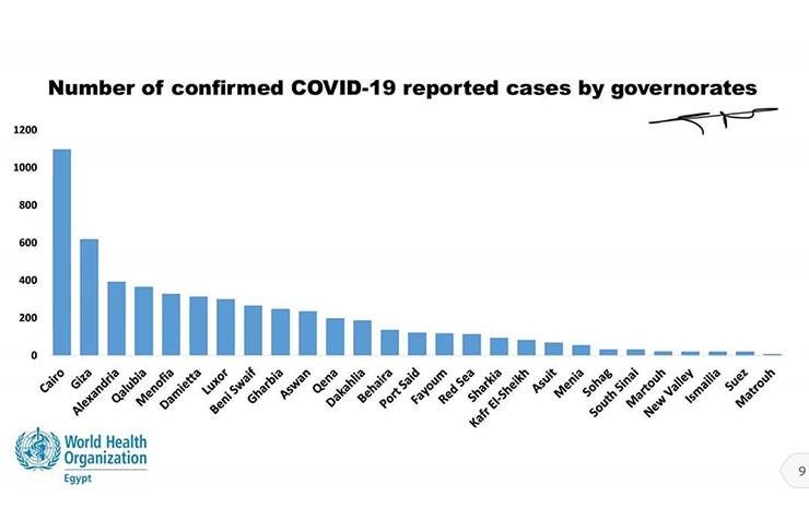 واحتلت القاهرة صدارة المحافظات في تسجيل إصابات بفيروس كورونا، بواقع 1100 حالة تقريبًا، تلتها محافظة الجيزة بحوالي 600 حالة، ثم الإسكندرية 400 حالة تقريبا.