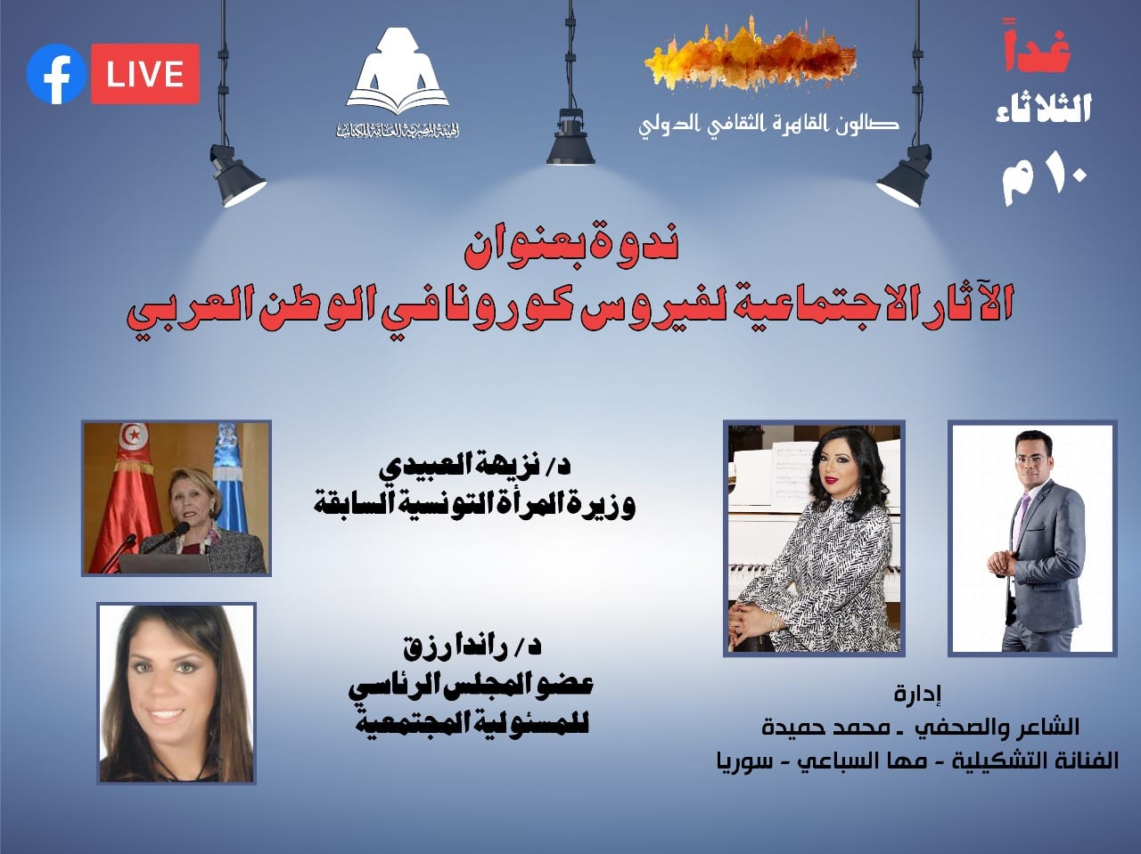 بالتعاون مع الهيئة المصرية العامة للكتاب برئاسة دكتور هيثم علي الحاج، وضمن الأنشطة التي تقدمها الهيئة عبر الصفحة الرسمية لمعرض القاهرة الدولي للكتاب ،ينظم صالون القاهرة الثقافي الدولي برئاسة الشاعر والكاتب الصحفي محمد حميدة، في العاشرة مساء الثلاثاء 19 رمضان ، حلقة نقاشية خاصة حول الآثار الاجتماعية لفيروس كورونا في المنطقة العربية، من خلال البث المباشر عبر صفحتي الصالون ومعرض القاهرة الدولي للكتاب، على موقع التواصل الاجتماعي "فيسبوك".