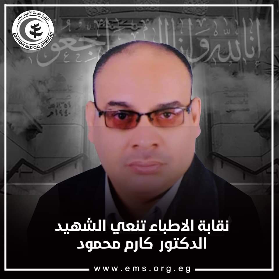نعت النقابة العامة للأطباء بمزيد من الحزن والأسى، الشهيد الدكتور كارم محمود رئيس قسم الباطنه بمستشفي الأقصر الدولى والذي توفي إثر إصابته بفيروس كورونا.