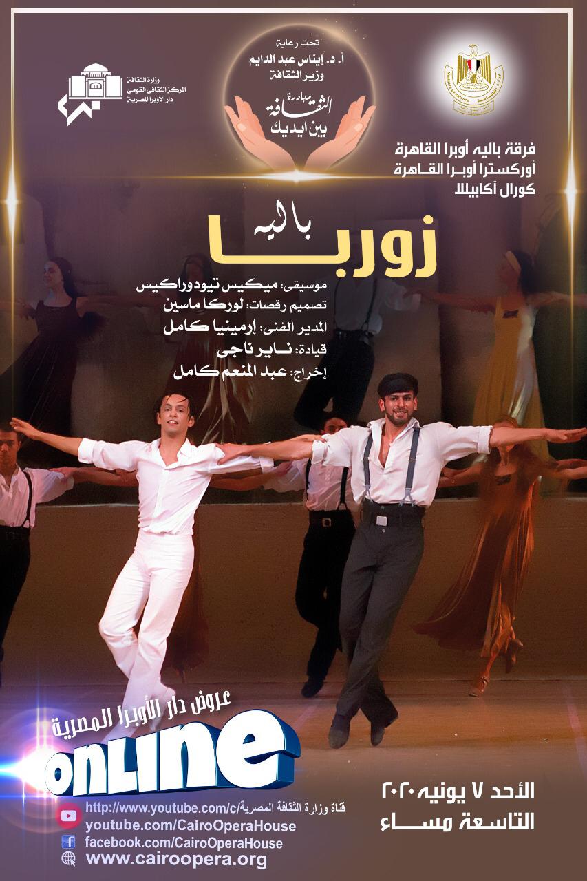 تبثوزارة الثقافةضمن فعاليات مبادرة الثقافة بين ايديك،فى التاسعة مساء غد الأحد،على قناتها بيوتيوب عرض الباليه العالمى الشهير زوربا لفرقة باليه أوبرا القاهرة بمشاركة كورال اكابيلا ومصاحبة أوركسترا أوبرا القاهرة بقيادة المايسترو ناير ناجى ومن اخراج الراحل الدكتور عبد المنعم كامل .