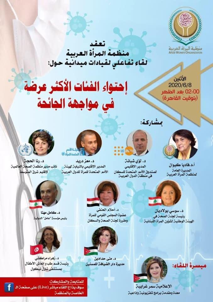 عقدت منظمة المرأة العربية لقاءً تفاعليًا حول: (احتواء الفئات الأكثر عرضة في مواجهة جائحة كورونا)،شارك فيه عدد من المثقفين، والمثقفات، والقيادات الميدانية العربية عبر الفضاء الإلكتروني.