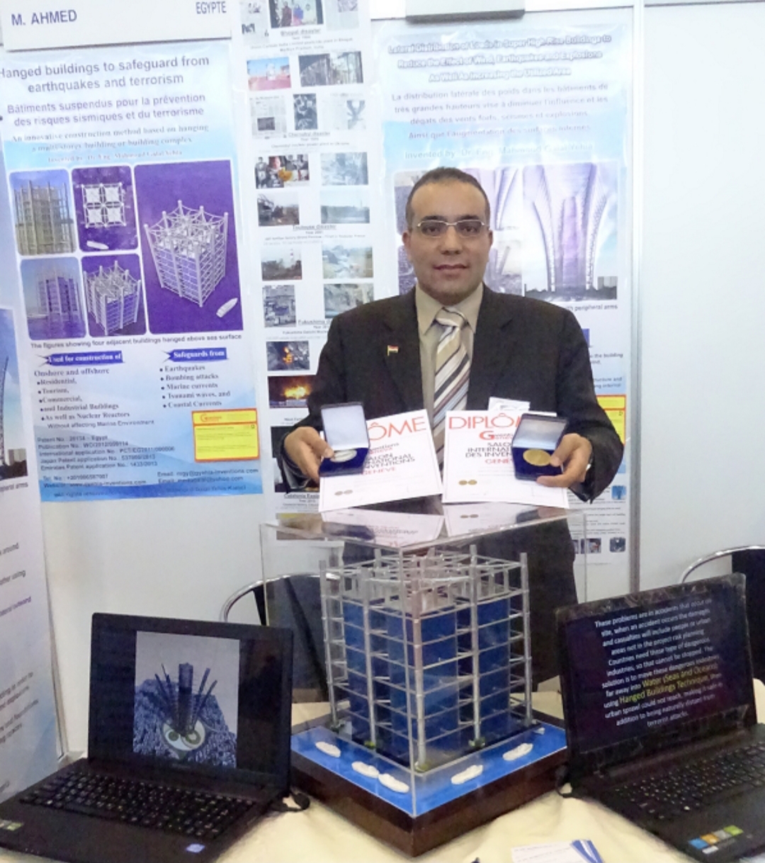 واوضح أن تقنية المباني المعلقة التي قام باختراعها تحت مسمى "المباني المعلقة للوقاية من الزلازل والإرهاب" وحصلت على براءة الاختراع من مصر و اليابان والإمارات بالإضافة لفحصها وإجازتها في مرحلة الفحص الدولي من مكتب براءات الاتحاد الأوروبي، وأيضا حصولها على الميدالية الذهبية بمعرض جنيف الدولي للاختراعات والذي يعتبر أكبر معرض للاختراعات في العالم، والميدالية الذهبية بالمعرض الأوروبي للإبداع والابتكار بدولة رومانيا، والميدالية الفضية بمعرض الشرق الأوسط للاختراعات بالكويت، بالإضافة للعديد من التكريمات ومنها درع أكاديمية البحث العلمي والتكنولوجيا للتميز العلمي، هذا بالإضافة إلي إشادة الأمم المتحدة بهذا الاختراع في كيفية نجاحه في حماية البشرية من مخاطر الكوارث.