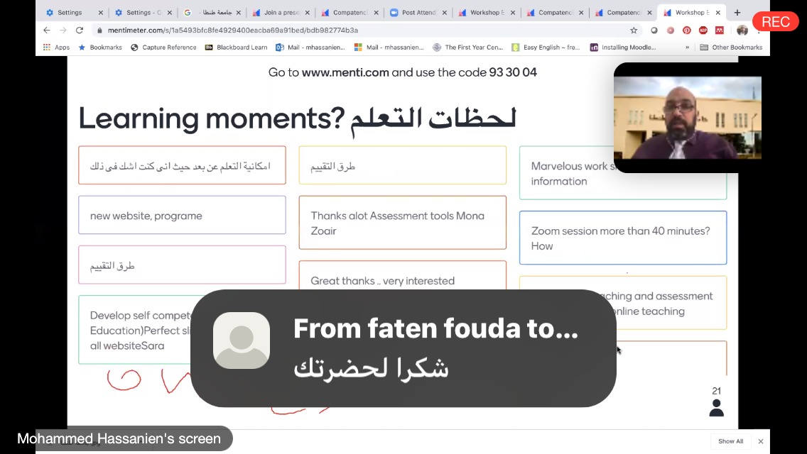 من جانبه أكد الدكتور محمد حسنين الأستاذ بكلية الطب جامعة طنطا، مستشار وكيل جامعة الملك عبد العزيز للشئون التعليمية، ومحاضر الورشة، أنه توجد خمس جدارات أو كفايات للتدريس عبر شبكة الانترنت؛ هي: مهارات الاتصال عن بعد، والثقافة التكنلوجية، وتصميم وبناء المقرر الإلكتروني، ومشاركة الطلاب في البيئة الرقمية، وأخيرًا التحدي الأكبر يتمثل في عملية التقييم والتقويم للمحاضرات الإلكترونية.