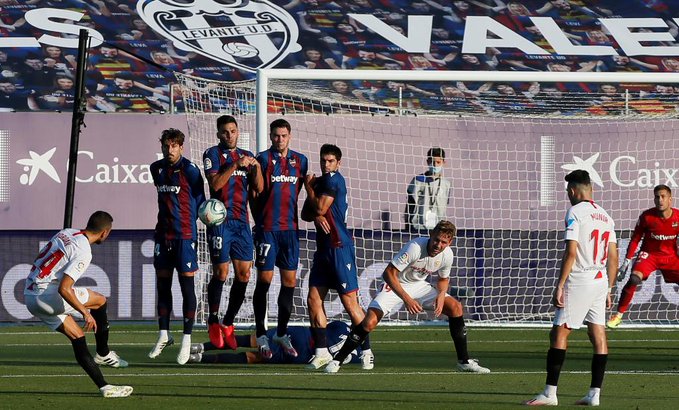 وسدد لاعبو إشبيلية 6 تسديدات منهم تسديدة على مرمى ليفانتي، بينما لم يسدد لاعبو ليفانتي كرة وحيدة، لينتهي الشوط الأول سلبي النتيجة بين الفريقين.