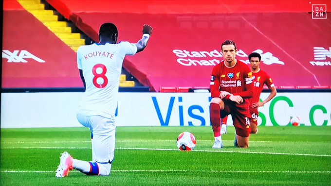 تضامن ناديا ليفربول وكريستال بالاس، مع جورج فلويد، ضحية العنصرية على يد قوات الشرطة الأمريكية، وذلك قبل انطلاق مباراتهما في الدوري الإنجليزي.