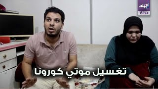 بدا الزوج بالحديث ان قريته يوجد بها عدد كبير من المصابين بالفيروس وعند حدوث حالة وفاة لا يوجد احد للقيام بغسيلة , فاتبرعنا أنا وزوجتى بالغسيل بجانب عملنا وكلة لوجه الله.