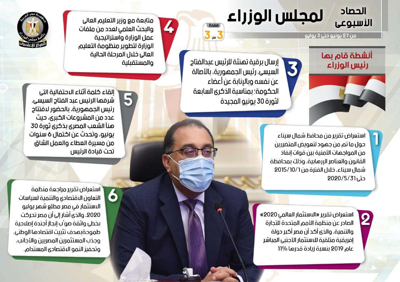 نشر المركز الإعلامي لمجلس الوزراء، إنفوجرافًا سلط من خلاله الضوء على الحصاد الأسبوعي لمجلس الوزراء، خلال الفترة من 27 يونيو حتى 3 يوليو 2020، والذي تضمن الموافقة على عدد من القرارات، فضلًا عن الاجتماعات واللقاءات التي عقدها الدكتور مصطفى مدبولي، رئيس مجلس الوزراء، بالإضافة إلى ما قام به سيادته من أنشطة.