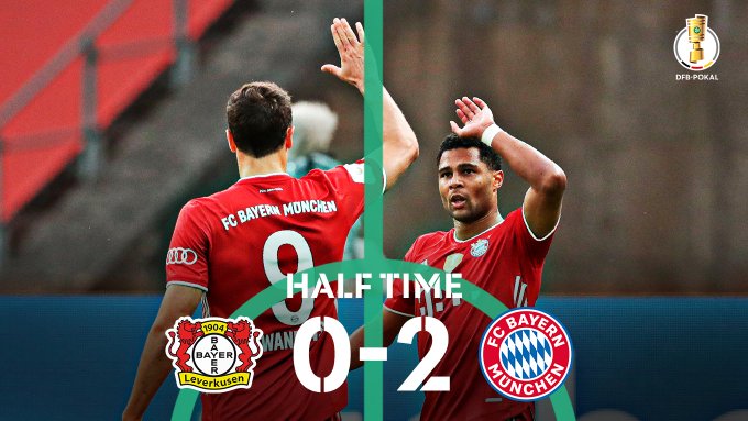 أنهي بايرن ميونخ الشوط الأول متقدما بهدفين دون رد على نظيره باير ليفركوزن، في المباراة التي تجمع الفريقين ضمن نهائي كأس ألمانيا، التي يستضيفهاملعب الأوليمبي بالعاصمة الألمانية "برلين".