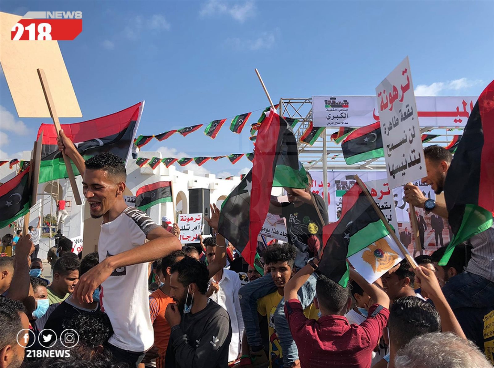 وذكرت قناة "218" المحلية الليبية، إن المتظاهرين رفعوا لافتات تحمل شعارات "لا للاحتلال العثماني" و "ليبيا ليست للبيع" و"جيشنا كرامتنا".