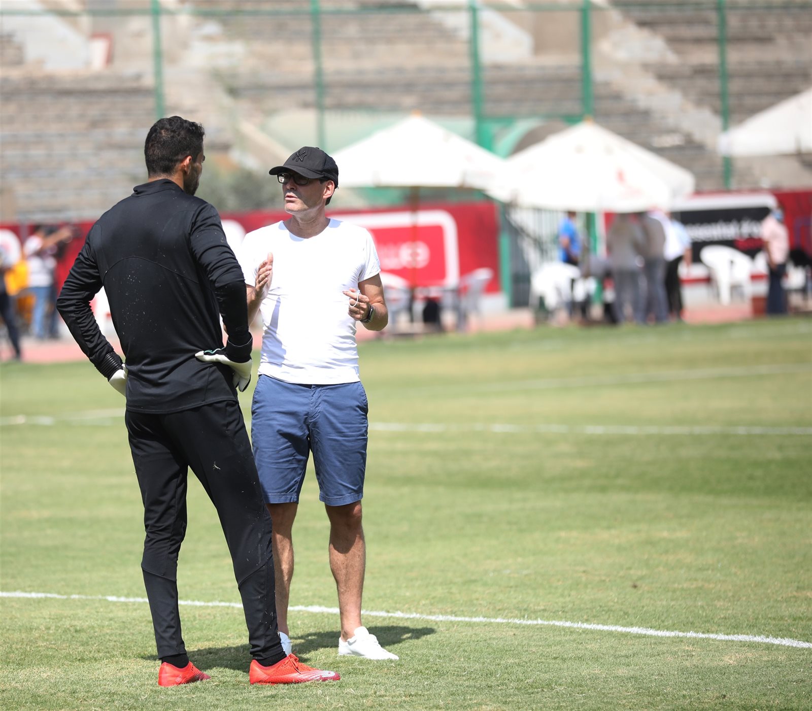 عقد رينيه فايلر، المدير الفني للفريق الأول لكرة القدم بالنادي الاهلي، جلسة مطولة مع شريف إكرامي حارس الفريق، على هامش المران الجماعي الذي أقيم صباح اليوم على ملعب التتش.
