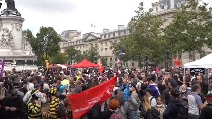 واحتشد المتظاهرون اليوم في ميدان بلاس دو لاربابليكا في باريس اليوم 14 يوليو ، للاحتجاج ضد الحكومة بعد دعوة من الاتحاد العام لنقابات العمال.