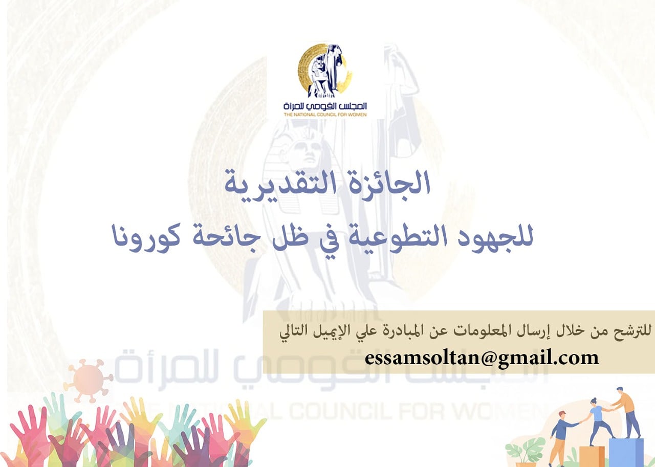 اعلن المجلس القومي للمرأه عن إطلاق "الجائزة التقديرية للجهود التطوعية فى ظل جائحة كورونا"