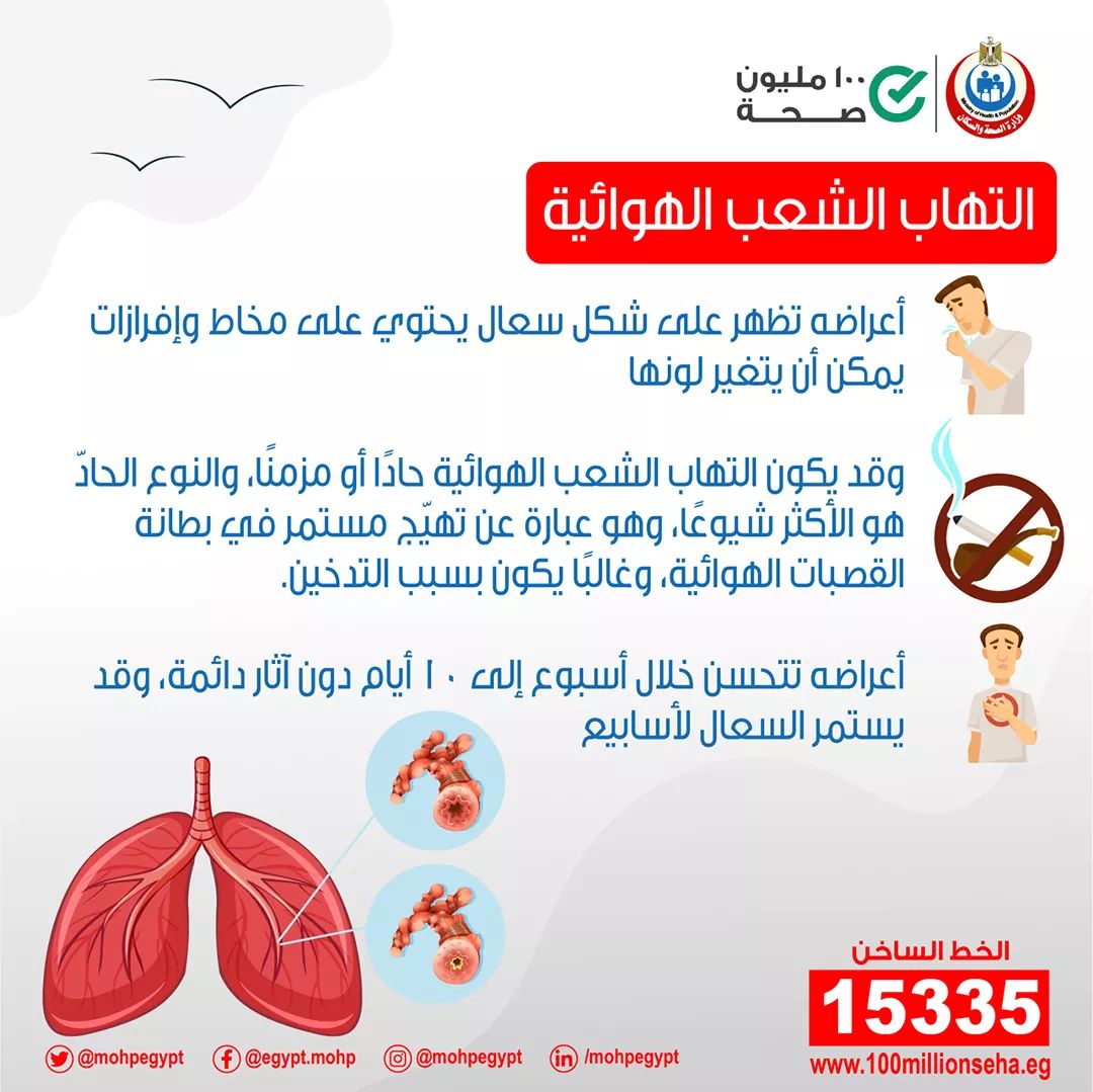 أعلنت وزارة الصحة و السكان، عن أعراض التهاب الشعب الهوائية، والتي تظهر على شكل سعال يحتوي على مخاط وإفرازات.