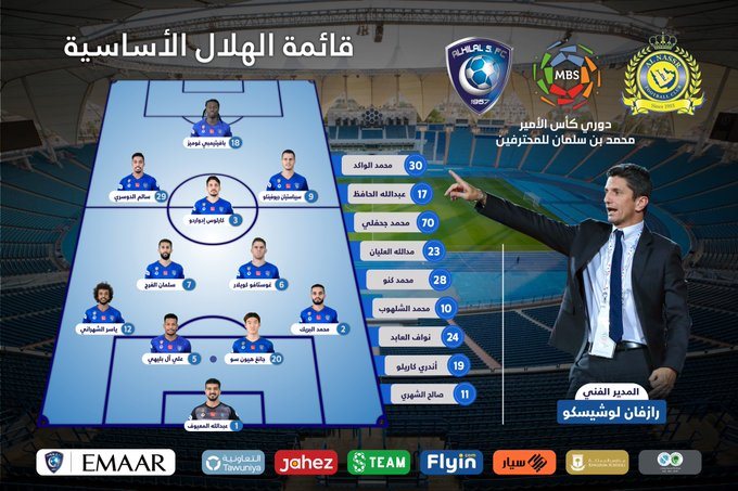 أعلن الروماني رازفان لوشيسكو، المدير الفني لفريق الكرة بنادي الهلال، عن تشكيل الفريق لمواجهة النصر، في ديربي الرياض على ملعب الملك فهد الدولي، ضمن منافسات الجولة 23 من مسابقة دوري كأس الأمير محمد بن سلمان للمحترفين.