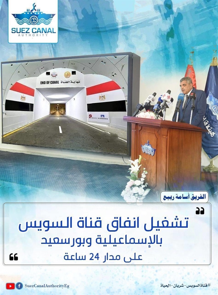 أعلن الفريق أسامة ربيع رئيس هيئة قناة السويس، تشغيل مجموعة أنفاق القناة ( تحيا مصر بالإسماعيلية و٣ يوليوببورسعيد)، علىمدار ٢٤ ساعة ابتداء من غد الأحد.