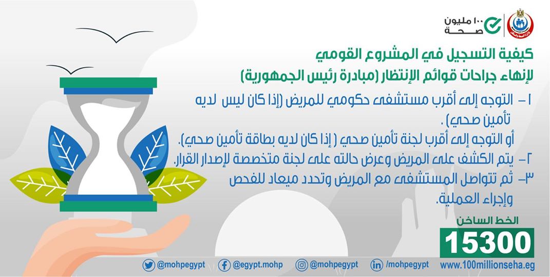 أعلنت وزارة الصحة، عن كيفية التسجيل في المشروع القومي لإنهاء جراحات قوائم الانتظار بمبادرة رئيس الجمهورية.