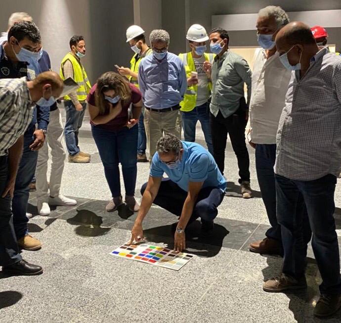 رافقه خلال الجولة الدكتور مصطفى وزيري الأمين العام للمجلس الأعلى للآثار، والأستاذ مؤمن عثمان رئيس قطاع المتاحف بالوزارة، والعميد هشام سمير مساعد الوزير للشئون الهندسية، والأستاذة ايمان زيدان مساعد الوزير للمواقع الأثرية، وأعضاء اللجنة العليا لسيناريو العرض المتحفي.
