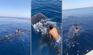 كشفت لقطات مذهلة نشرتها صحيفة ديلي ميل البريطانية، رجلا يقفز على ظهر سمكة القرش الحوتى ويحاول ركوبها بعد التشبث بزعنفتها الظهرية في البحر الأحمر.