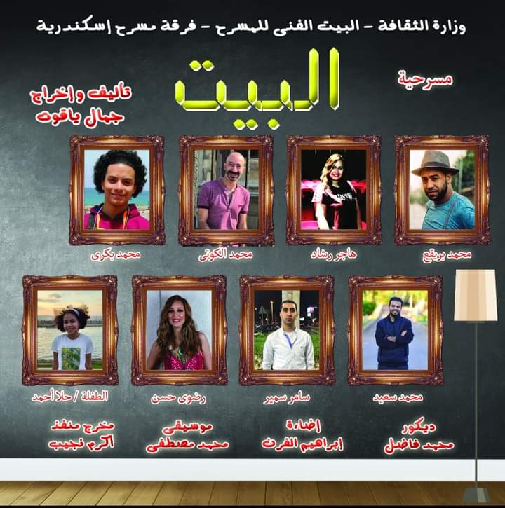 "البيت" البطولة للفنانين "محمد بريقع، هاجر رشاد، محمد كوتي، محمد بكري، محمد سعيد، سامر سمير، رضوى حسن"، والطفلة : حلا أحمد، ديكور : محمد فاضل، إضاءة : إبراهيم الفرن، موسيقى : محمد مصطفى، مخرج منفذ : أكرم نجيب، تأليف وإخراج : جمال ياقوت.