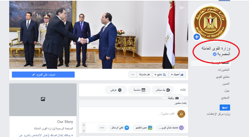 وتؤكد وزارة القوي العاملة، أن لديها صفحة رسمية على موقع التواصل الاجتماعي "facebook" تحت اسم "وزارة القوى العاملة المصرية " وتحمل شارة التحقق الزرقاء كصفحة رسمية معتمدة.