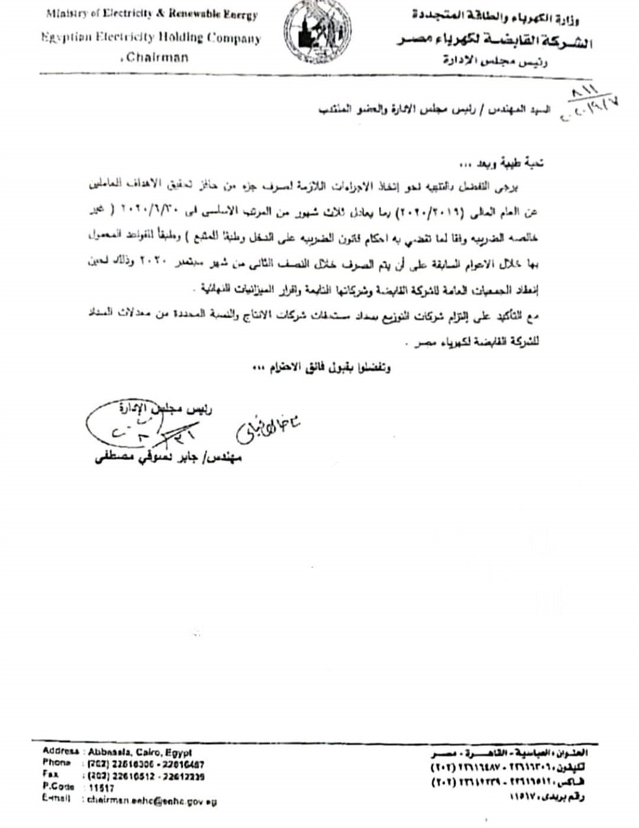 قررت الشركة القابضة لكهرباء مصر صرف حافز تحقيق الأهداف للعاملين عن العام المالى 2019-2020، بما يعادل ثلاثة أشهر من المرتب الأساسي بنهاية شهر يونيو الماضي.