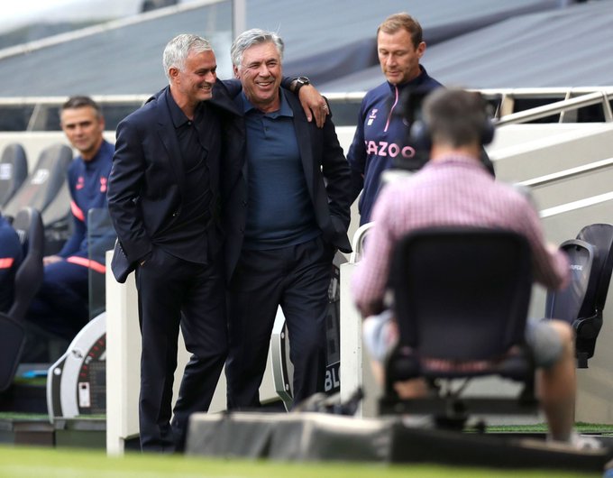 وقبل المباراة، التقطت عدسات كاميرات المصورين لقطة رائعة بين كارلو أنشيلوتي مدرب إيفرتون وجوزيه مورينيو مدرب توتنهام، حيث قاما بمعانقة بعضهما البعض.