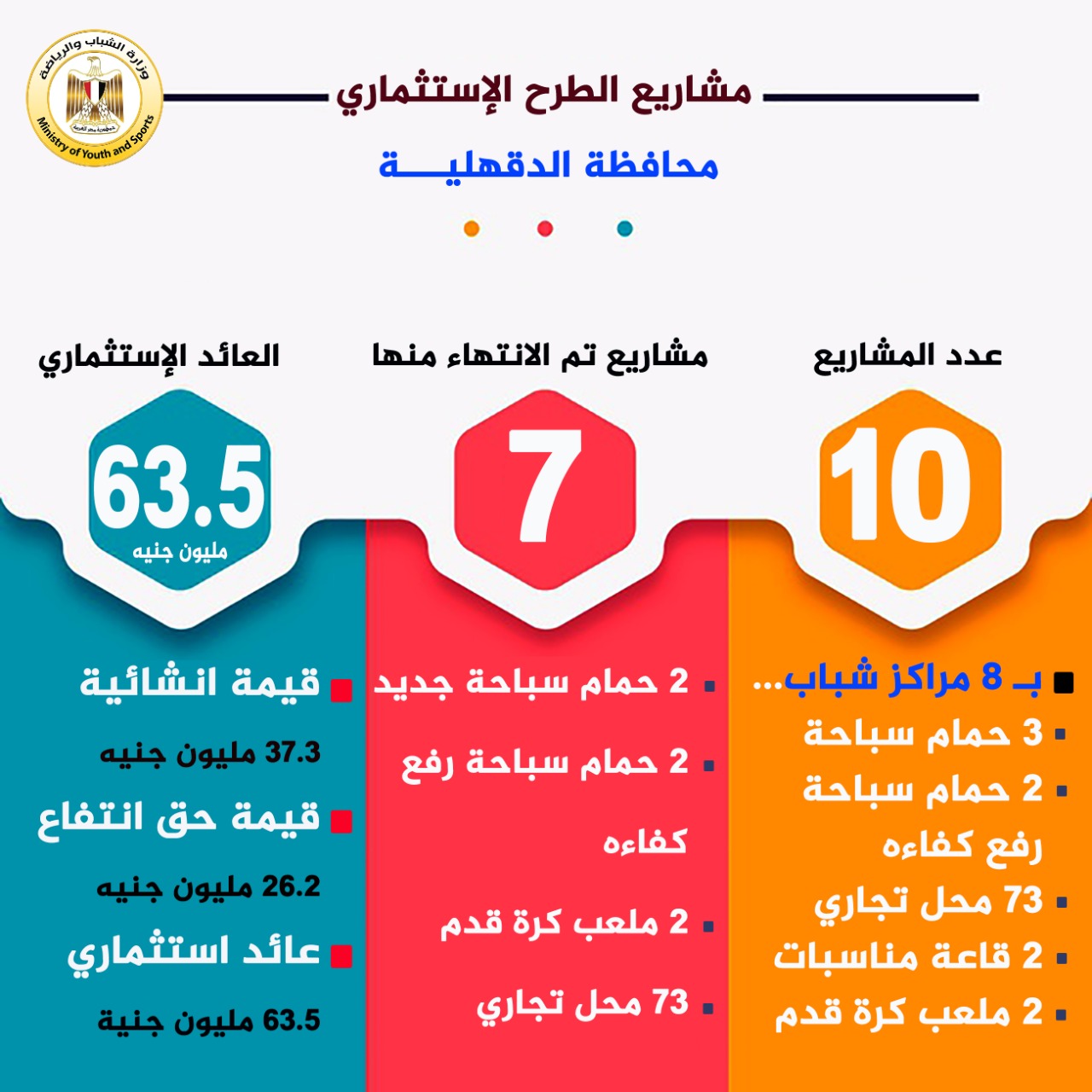 أعلنت وزارة الشباب والرياضة أنه تم الانتهاء من تنفيذ 7 مشروعات استثمارية بنظام حق الانتفاع ( BOT ) بعدد من مراكز الشباب بمحافظة الدقهلية وجار الانتهاء من 3 مشروعات بتكلفة انشائية قدرها 37.3 مليون جنيـه حيث تم الانتهاء من إنشاء 2 حمام سباحة بمركز شباب مدينة المطرية ومدينة ميت غمر ، وتطوير ورفع كفاءة 2 حمام سباحة بمركزي شباب الديرس ومدينة بلقاس.