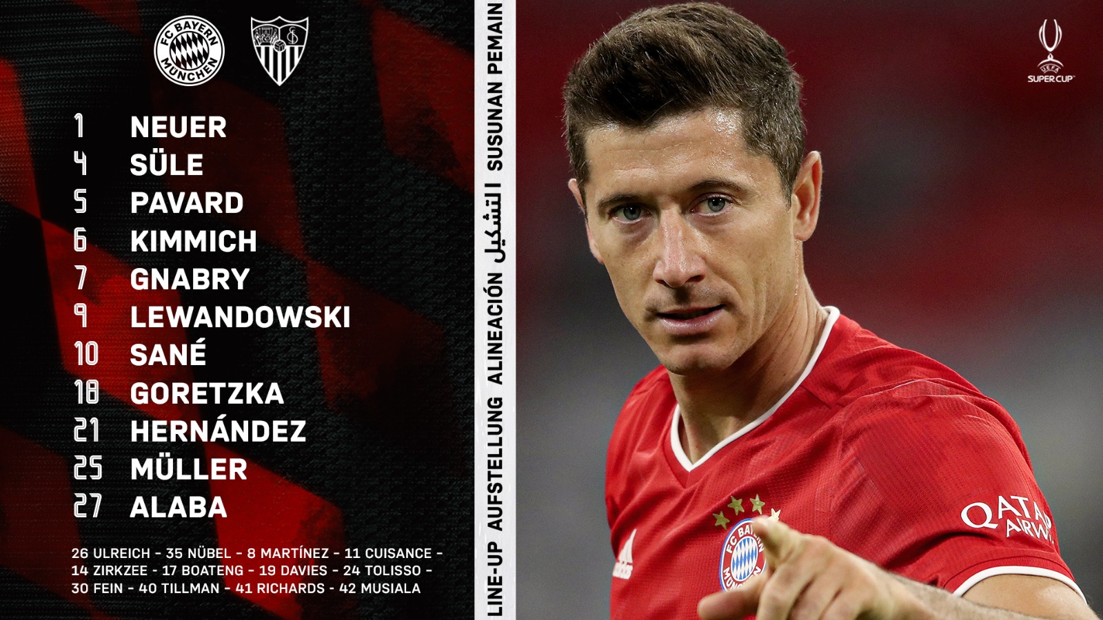 أعلن هانز فليك، المدير الفني لفريق بايرن ميونخ الألماني، وجولين لوبيتيجى مدرب إشبيلية الإسبانى، التشكيل الأساسى الذى يخوض المواجهة النارية المقرر إقامتها في تمام التاسعة من مساء اليوم، الخميس، على ملعب "بوشكاش أرينا" فى العاصمة المجرية بودابست.