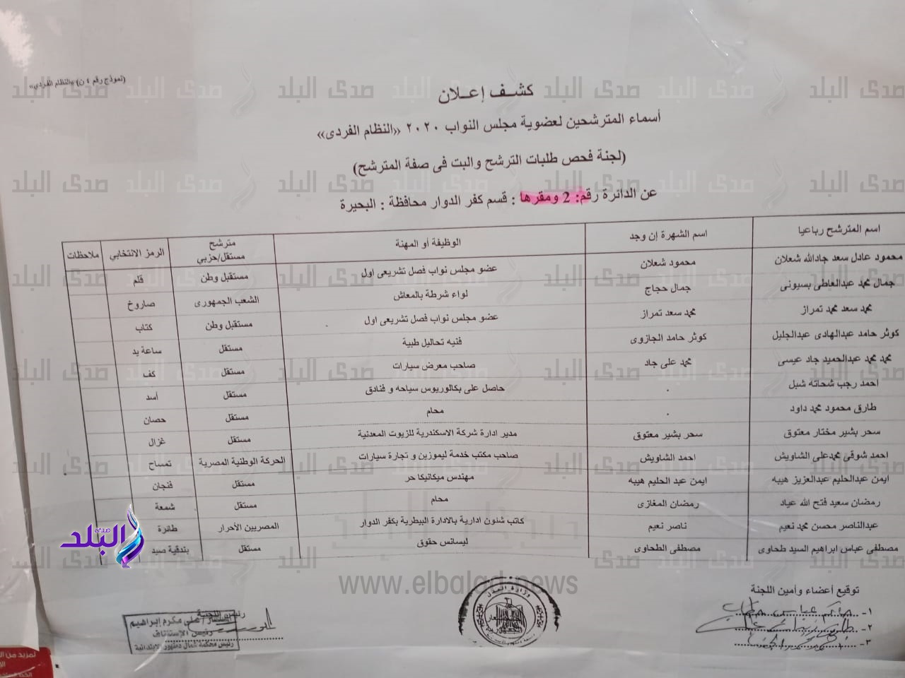 أعلنت اللجنة المشرفة على انتخابات مجلس النواب في محافظة البحيرة، والمنعقدة بمحكمة دمنهور الابتدائية، اليوم الاثنين، عن أسماء مرشحي انتخابات مجلس النواب 2020، وبلغ عدد المرشحين الذين تم قبول أوراقهم لخوض الانتخابات 200 مرشحا في عدد 9 دوائر بالنظام الفردي.