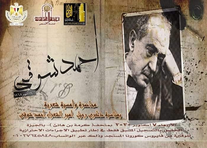 ينظم المجلس الأعلى للثقافة بأمانة الدكتور هشام عزمي؛ والدكتور محمد أبو الفضل بدران مقرر لجنة الشعر بالمجلس؛ ندوة وأمسية شعرية بمناسبة ذكرى رحيل أمير الشعراء أحمد شوقى.