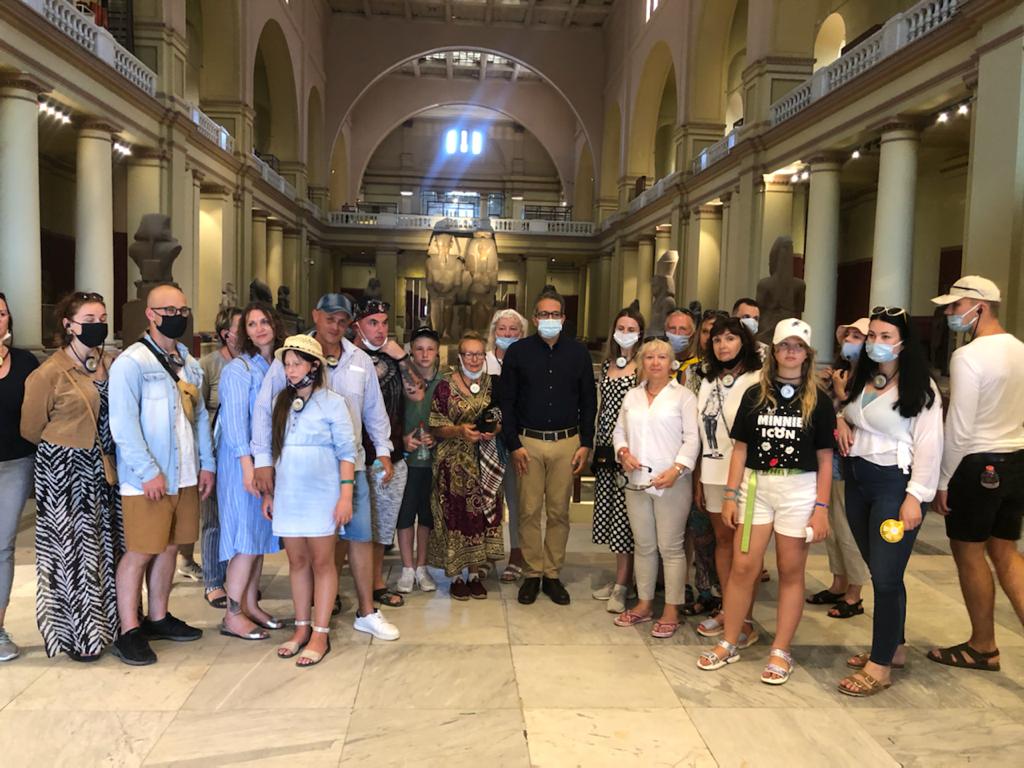 وأثناء الجولة التقي وزير السياحة والاثار بفوج من السائحين الاوكرانيين والبيلاروس والذين حرصوا علي التقاط صورة تذكارية معه مشيدين بالاجراءات الاحترازية التي يتم تطبيقها في المتاحف والمواقع الاثرية والمنشآت السياحية والفندقية مما يجعلهم يشعرون بالطمأنينة والاستماع بإجازاتهم وبرامجهم السياحة في نفس الوقت.