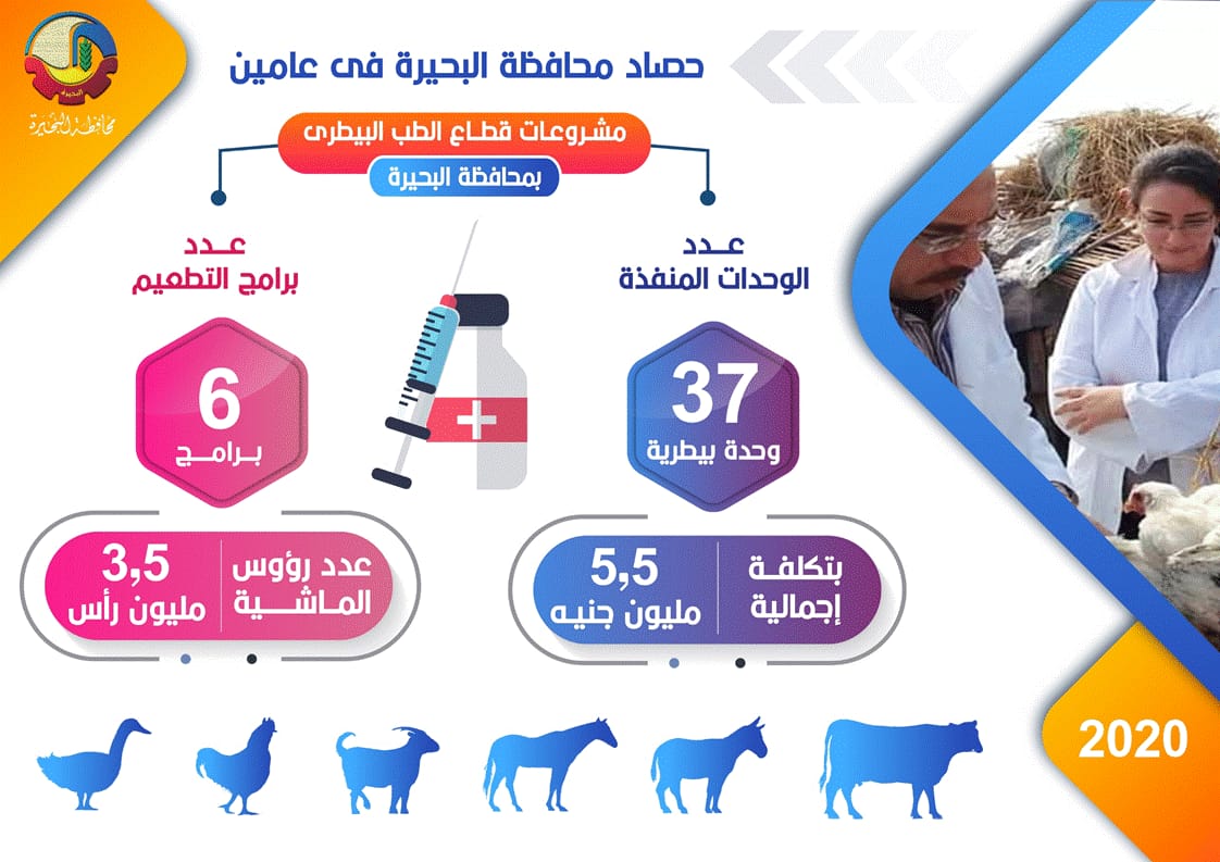 في نفس السياق نشر المكتب الإعلامي لمحافظة البحيرة، ٱنفوجراف يسلط من خلاله الضوء على حصاد عامين من الإنجازات بقطاع الطب البيطرى بمحافظة البحيرة، وذلك خلال الفترة من عام ٢٠١٨ وحتى عام ٢٠٢٠ .