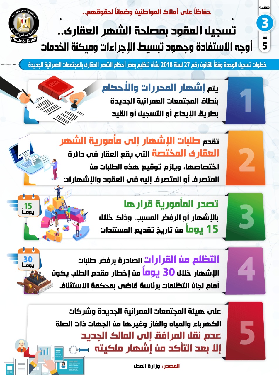 وأظهر الإنفوجراف أن المأمورية تُصدر قرارها بالإشهار أو الرفض المسبب، وذلك خلال 15 يومًا من تاريخ تقديم المستندات، بينما يكون التظلم من القرارات الصادرة برفض طلبات الإشهار خلال 30 يومًا من إخطار مقدم الطلب أمام لجان التظلمات برئاسة قاضي بمحكمة الاستئناف، كما تلتزم كل من هيئة المجتمعات العمرانية الجديدة وشركات الكهرباء والمياه والغاز وغيرها من الجهات ذات الصلة بعدم نقل المرافق إلى المالك الجديد إلا بعد التأكد من إشهار ملكيته.
